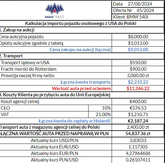 Całkowity koszt sprowadzenia auta z USA do Polski to suma wielu opłat, od transportu po podatki